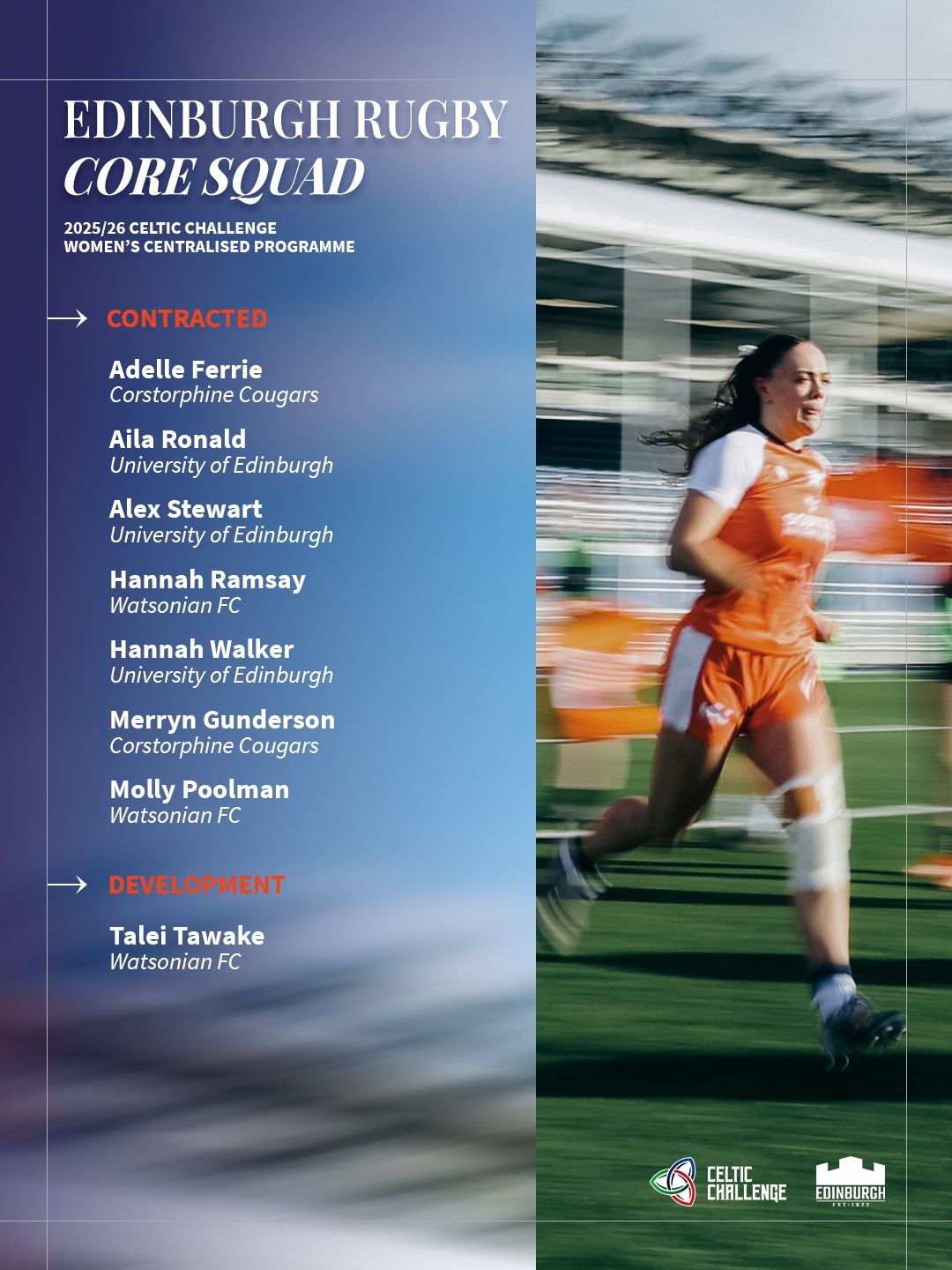 Edinburgh Rugby can today confirm the centrally supported players that will form the core squad for the upcoming 2025/26 Celtic Challenge.
