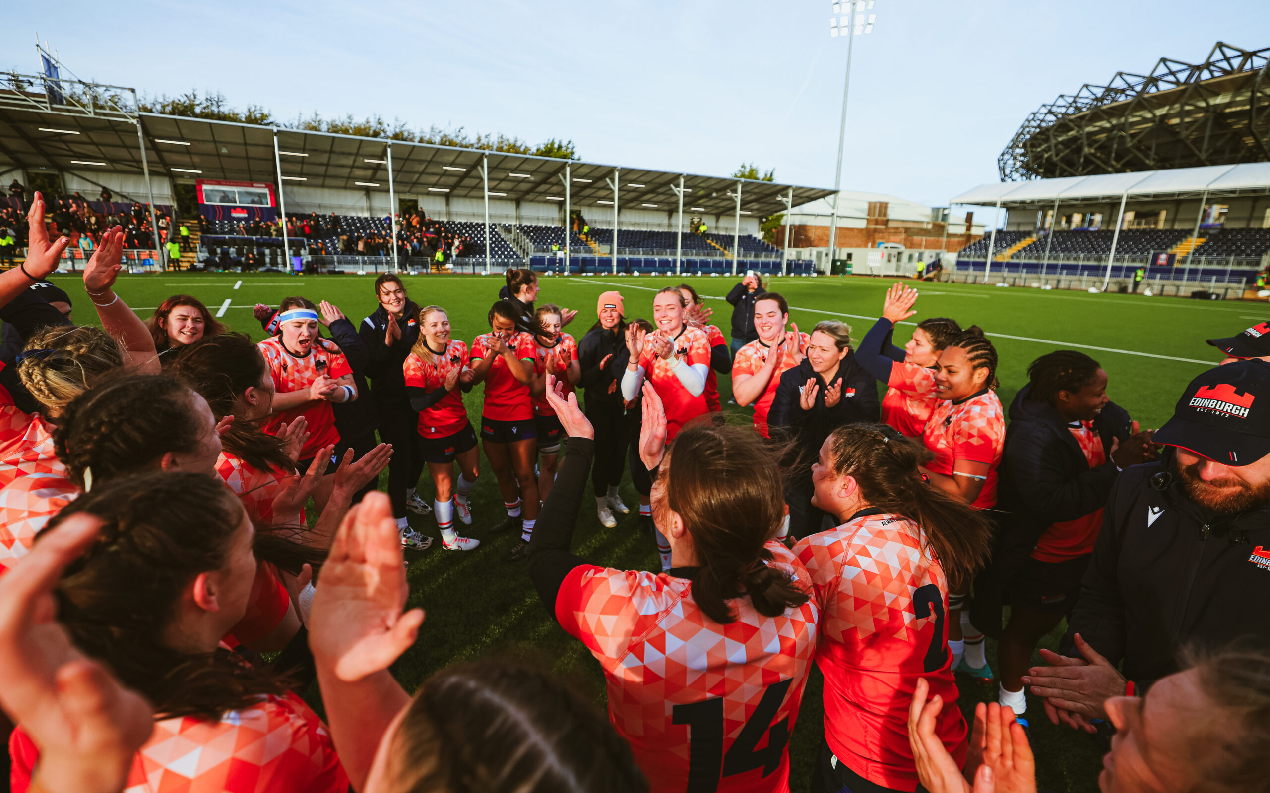 EDINBURGH, SCOTLAND - FEBRUARY 03: The Edinburgh squad celebrates at full-time during a Celtic Challenge match Edinburgh Rugby Women and Clovers at Hive Stadium, on February 03, 2024, in Edinburgh, Scotland. (Photo by Ewan Bootman / SNS Group)
