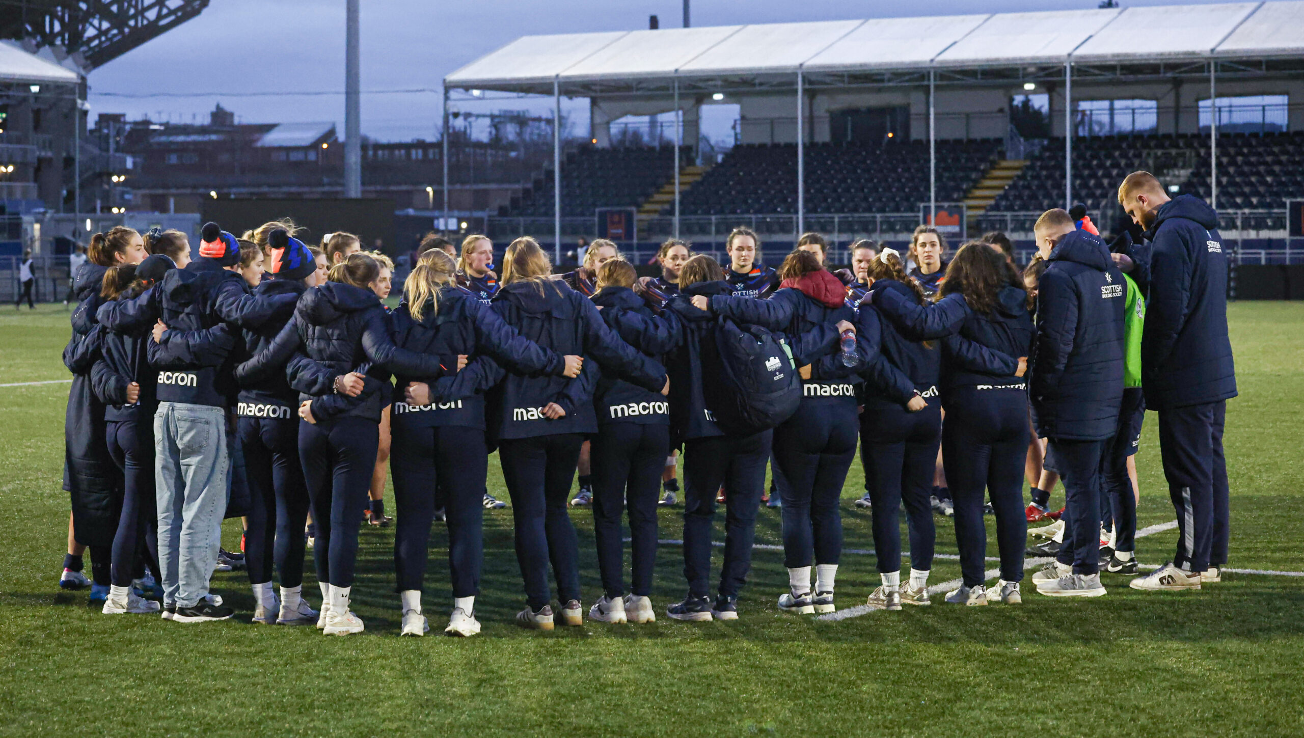 EDINBURGH, SCOTLAND - JANAURY 31: The Edinburgh team huddle at full time during a Celtic Challenge match between Edinburgh Women and Brython Thunder at the Hive Stadium, on January 31, 2026, in Edinburgh, Scotland. (Photo by Mark Scates / SNS Group) The Heriot’s flyer comes into the side as one of two changes to the capital starting side, with centre Lisa Brown also moving from the bench to start.