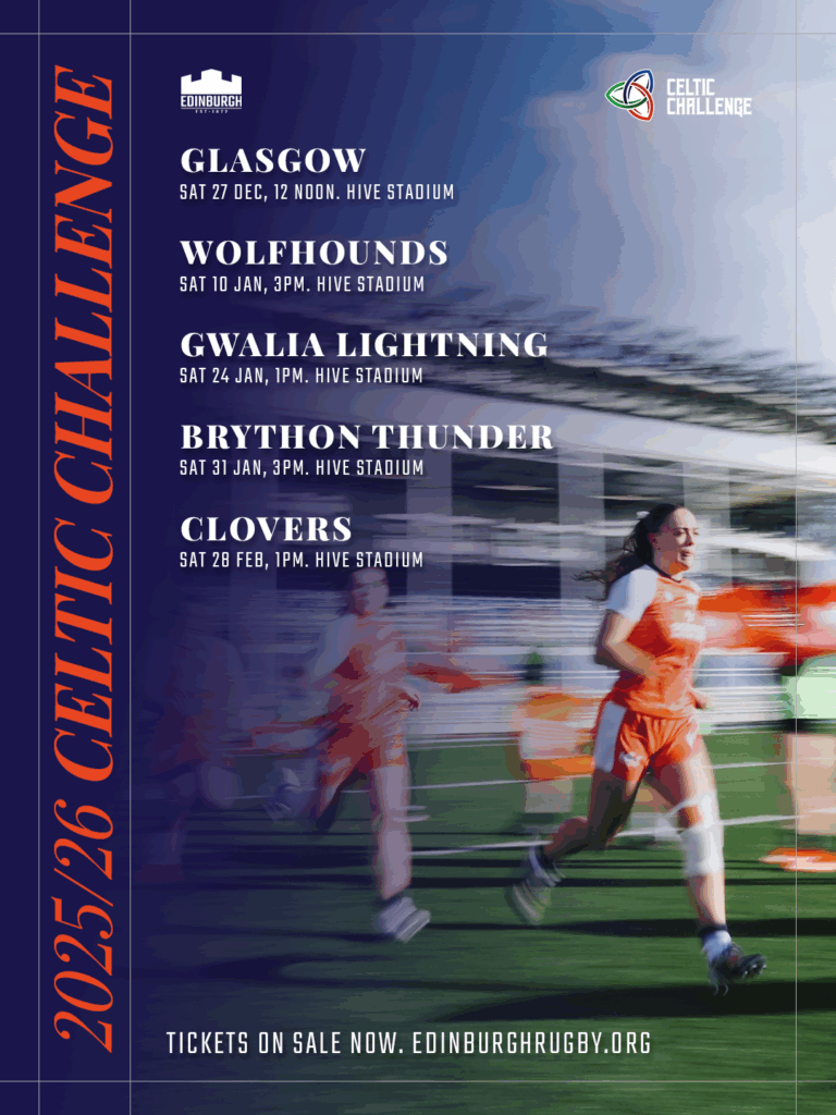 Player News Venter to join Emirates Lions 15 December 2025 EPCR Castres power past young Edinburgh side 14 December 2025 EPCR Everitt backs youth in Castres clash 14 December 2025 EPCR Currie returns for Castres clash 12 December 2025 Player News Blyth-Lafferty commits to Edinburgh until 2028 11 December 2025 1872 Cup General 1872 Cup: More seating added! 11 December 2025 EPCR Lawrie: “The boys are aware of the challenge in Castres.” 10 December 2025 Player Sponsorship Player Sponsor Spotlight: De Luca Corporate Coaching 10 December 2025 EPCR Toulon tussle: Edinburgh secure stunning win 8 December 2025 EPCR Gilchrist: “If you can’t get excited about playing this week, then you’re in the wrong place.” 5 December 2025 Player Sponsorship Player Sponsor Spotlight: It’s Good 2 Give 5 December 2025 EPCR Graham and Ashman return for Toulon opener 5 December 2025 EPCR What’s on Guide: RC Toulon 4 December 2025 EPCR Everitt: “The guys are excited to be back In the Champions Cup.” 4 December 2025 Sponsors & Partners Edinburgh Rugby and it’s good 2 give celebrate £50,000 milestone 4 December 2025 EPCR Next up: RC Toulon 2 December 2025 URC Edinburgh edge Ospreys in Saturday night showdown 29 November 2025 Sponsors & Partners Edinburgh Rugby welcomes LNER as new Community Impact Partner 28 November 2025 URC Muncaster to hit 50 against Ospreys 28 November 2025 1872 Cup General Everitt: “The 1872 Cup is the jewel in the crown of a colossal run for Edinburgh.” 25 November 2025